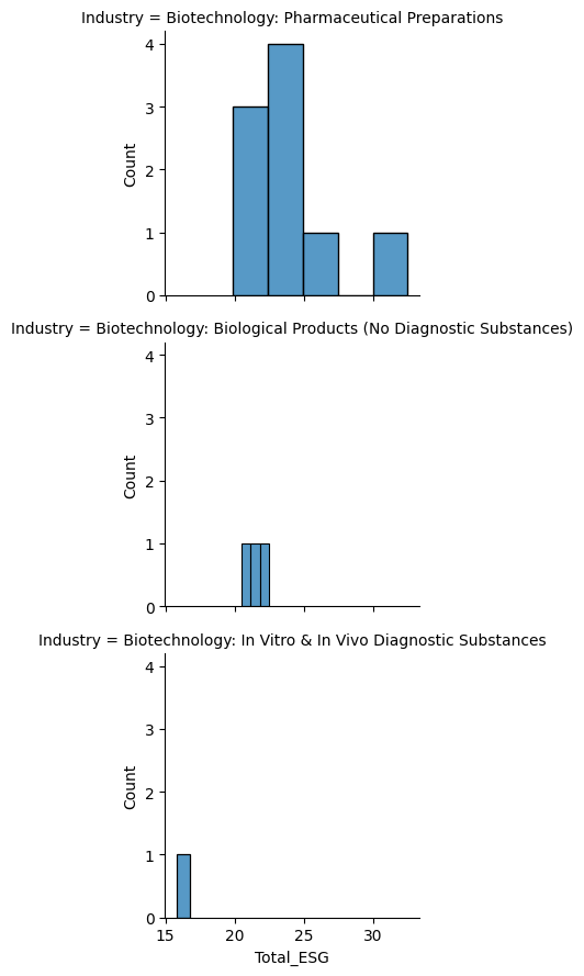 Looking at the distributions of ESG values, it looks like there is little variation in the companies dealing with Biological Products and Biotechnology. However, there is incredibly limited data for these two industries. The information that we would get from the correlation of these two would not be informational, so I am going to pivot and focus primarily on Pharmaceutical Preparations.