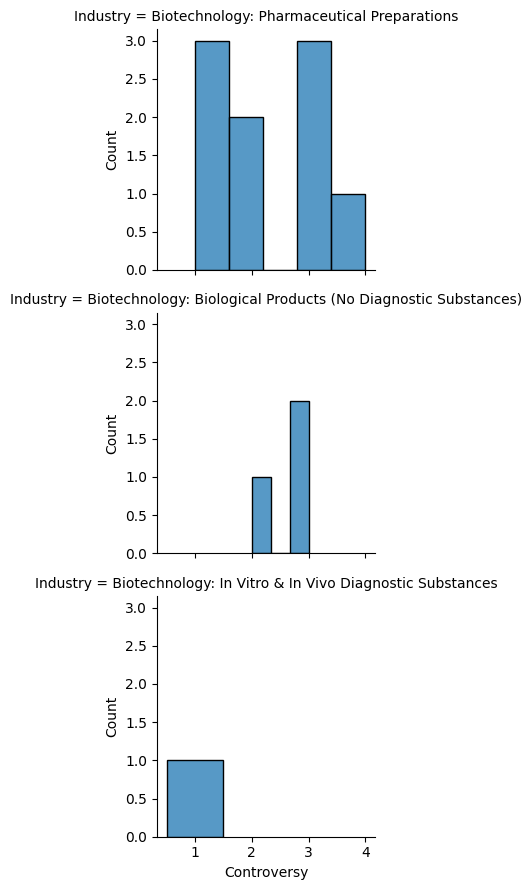 Next, I want to look at the third question I had, which was relating the controversy scores of each bio-related company to their annual total return.