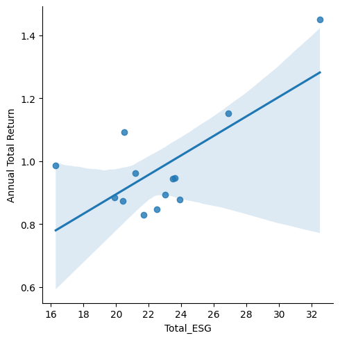 Limited by data size, and collection time, I was unable to find conclusive results beside the fact that there was a positive relationship between Annual Total Return and ESG risk score in 2025.